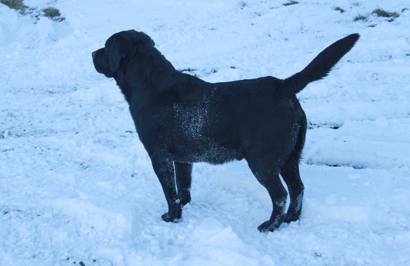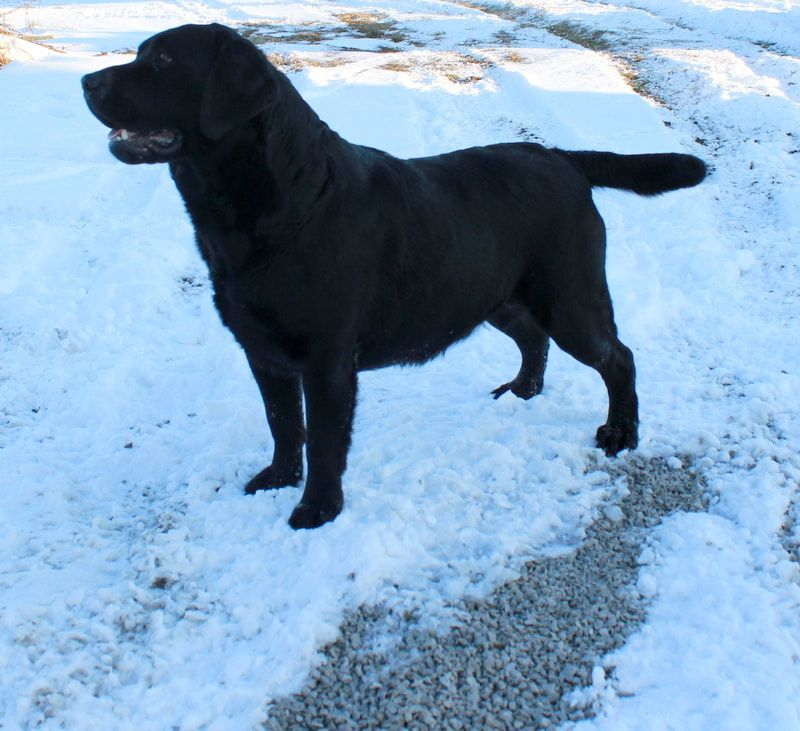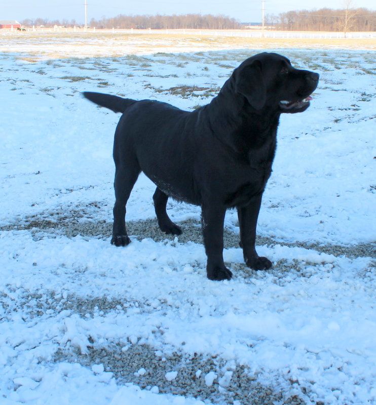 Houston is our strong man! He has a thick tail and a thick black wavy coat that is noticeable in the British lines. Houston produces yellow, black, and chocolate puppies. His grandpa was a show champion. He is very muscular with a mild temperament.